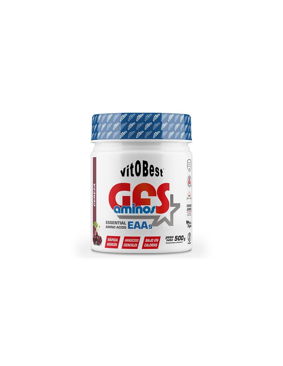 Ingredientes: GFSaminos™ (Ajinomoto®) (L-Leucina, L-Valina, L-Iso- leucina, L-Lisina, L-Treonina, L-Fenilalanina, L-Arginina, L-Metionina, L-Triptófano, L-Histidina), edulcorantes: eritritol y xilitol, acidulante: ácido cítrico anhidro, aromas: bitter blocker y cereza, edulcorante: sucralosa, colorante: E-124 e hidrocloruro de piridoxina (vitamina B6).