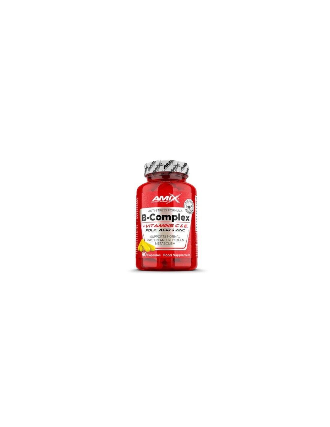 Amix™ B-Complex es un complemento alimenticio en cápsulas que contiene una combinación única de vitaminas B1, B2, niacina, ácido pantoténico, B6, ácido fólico, B12, C, E, zinc y biotina. La vitamina B6 contribuye al metabolismo normal de las proteínas y del glucógeno.
