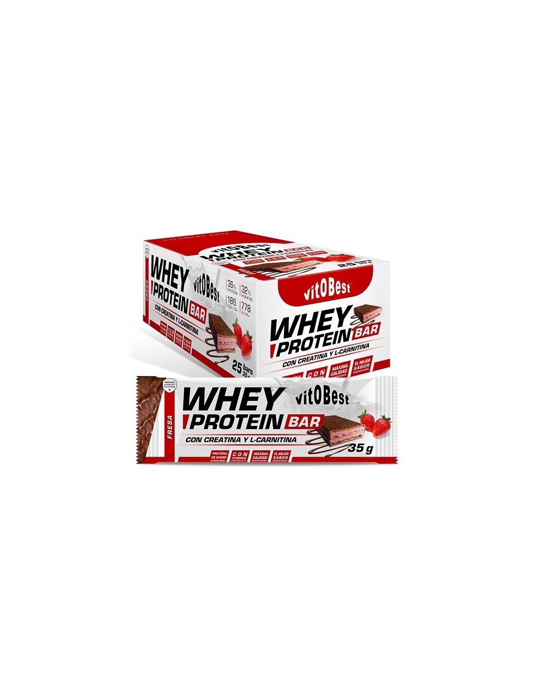 Whey Protein Bar, de Vitobest®, es un estupendo snack pensado y elaborado para aportarte la energía y los nutrientes que necesitas en tu día a día. Contiene un 36 % de proteína de suero lácteo ultrafiltrado, 1500 mg de Creatina, 500 mg de L-Carnitina y un complejo vitamínico, cuya cantidad (si consumimos dos barritas en una jornada) cubre la cifra diaria recomendada para el correcto funcionamiento de nuestro organismo.