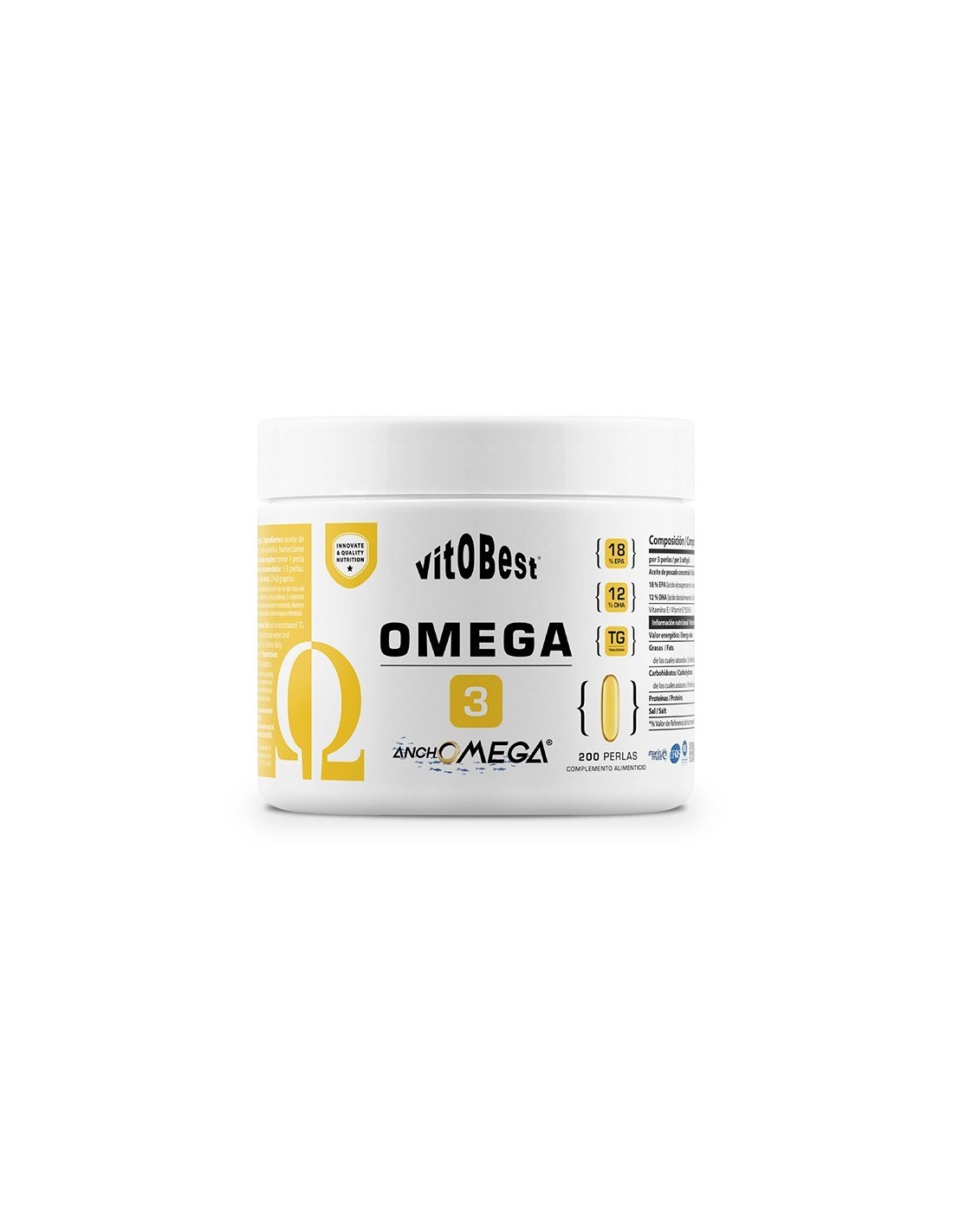 Ingredientes: aceite de pescado concentrado TG 18/12 (AnchOmega®), perla: gelatina, humectante (glicerina) y agua y tocoferoles (vitamina E).