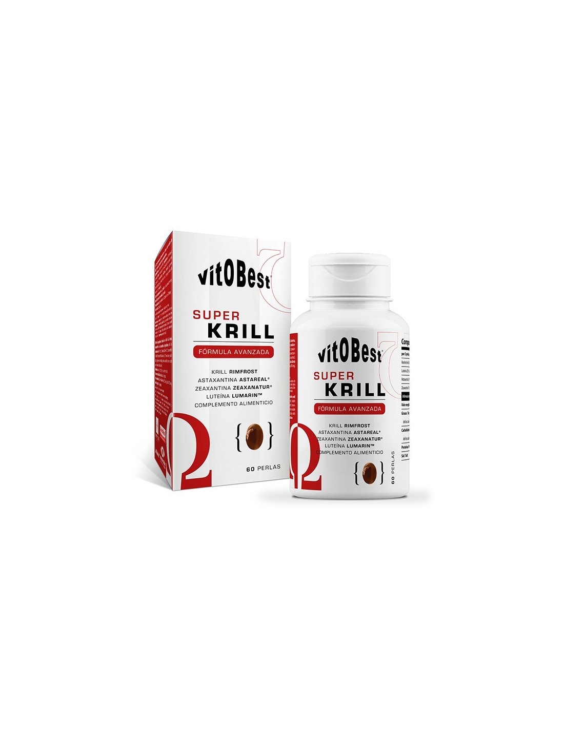 La novedosa y concentrada fórmula de Super Krill, de Vitobest®, contiene aceite de krill: 5,5 % de ácido docosahexaenoico (DHA), 10 % de ácido eicosapentaenoico (EPA)], 40 % de fosfolípidos (mayor concentración que cualquier otro krill del mercado) y astaxantina.