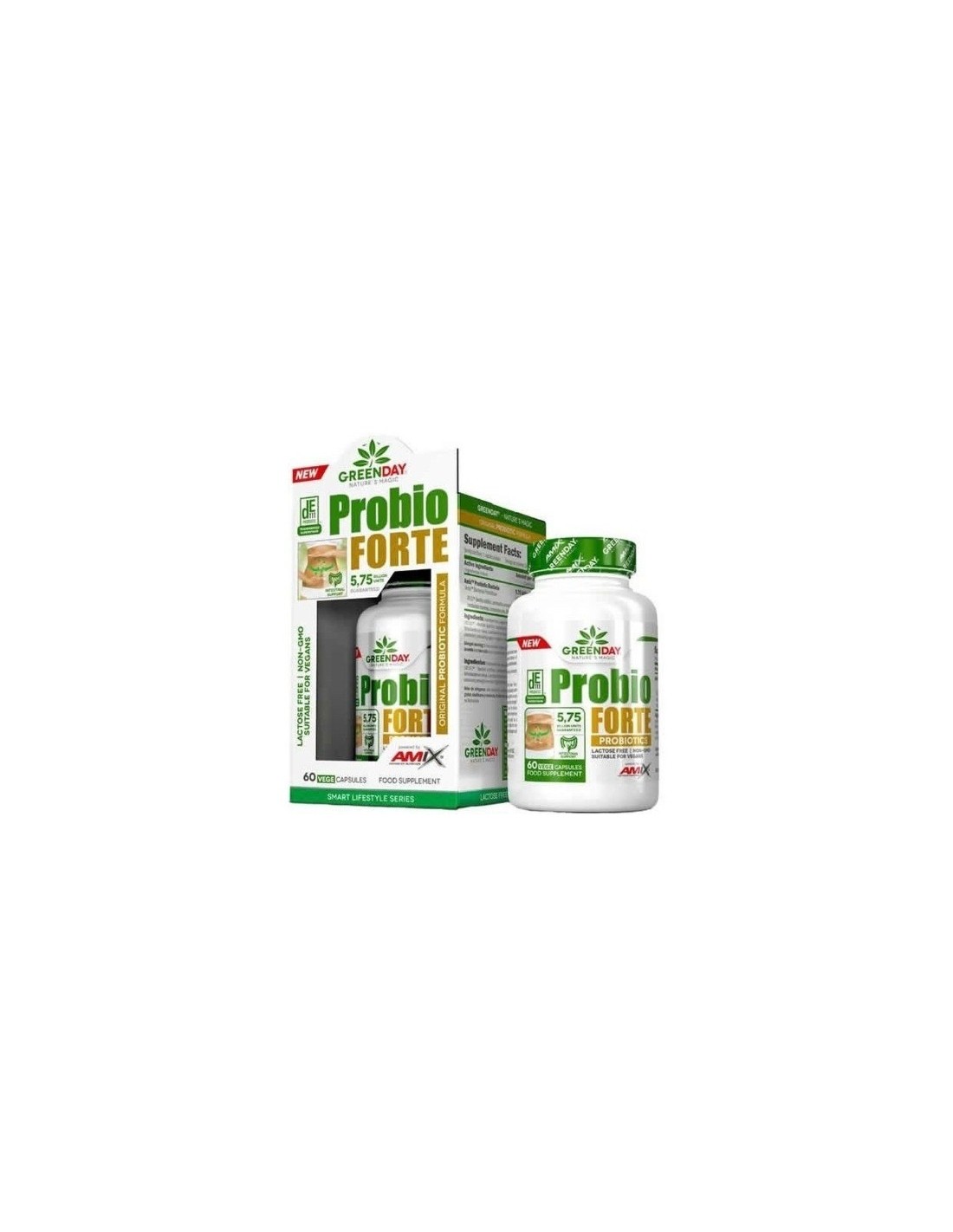 GreenDay® Probio Forte es un complemento alimenticio formulado con una mezcla de 7 cepas de bacterias probióticas, proporcionando 5.75 mil millones de unidades formadoras de colonias (CFU) por cápsula. Está diseñado para apoyar el equilibrio de la microbiota intestinal. Las cápsulas son vegetales, aptas para vegetarianos y veganos.