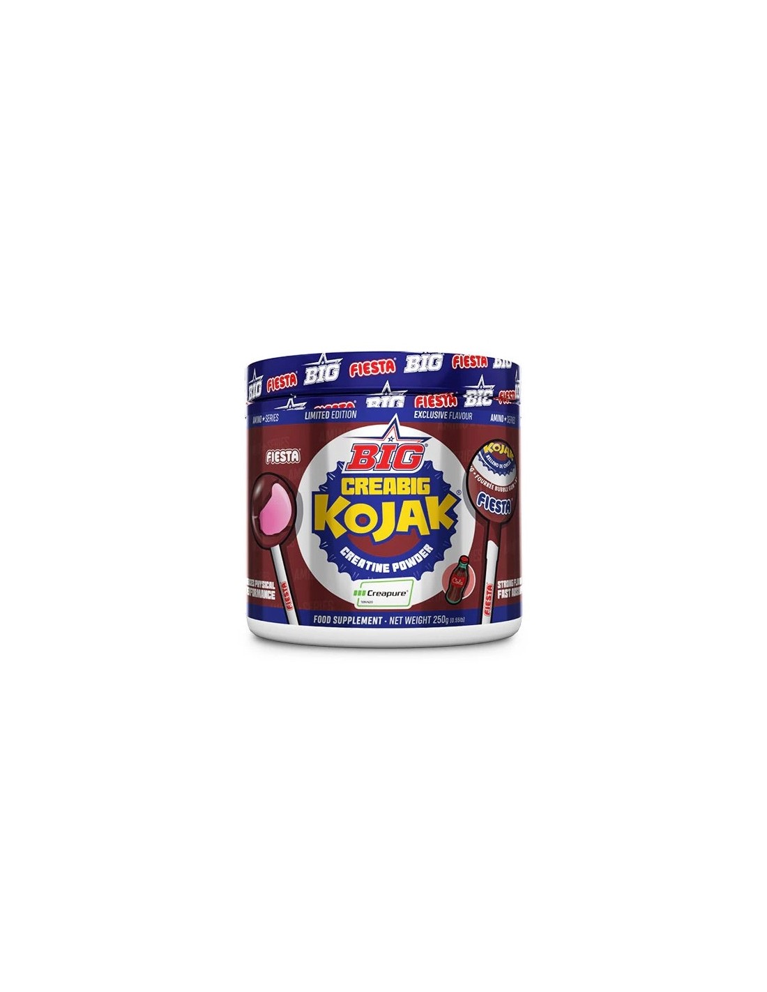 Ahora, de nuevo fruto de la mejor investigación y calidad, la familia Creabig sigue creciendo con el nuevo Creabig edición exclusiva FIESTA® sabor KOJAK® COLA con sello Creapure®. Vuelve a tu infancia una vez más con el nuevo y refrescante sabor KOJAK® COLA.