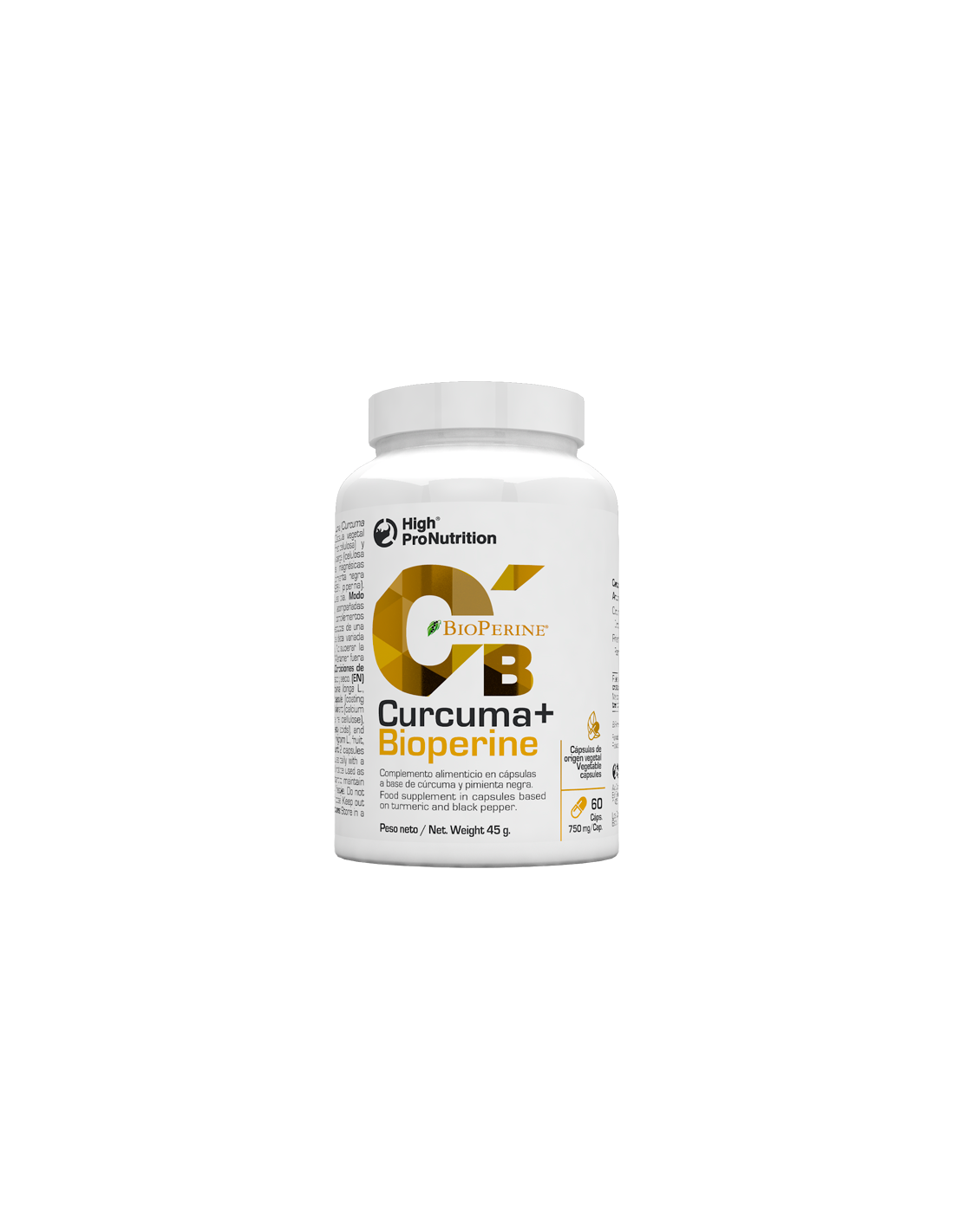 Cúrcuma Bioperina de High Pro Nutrition, es un complemento alimenticio en cápsulas que combina extracto seco de rizoma de Cúrcuma (Curcuma longa L.) con Bioperine®.