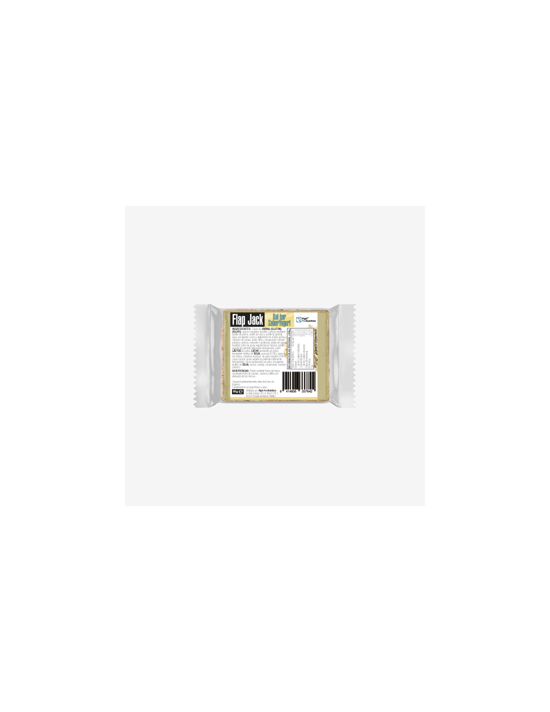 Ingredientes: Copos de AVENA (GLUTEN) (50%), Jarabe de azúcar invertido, Margarina [aceites y grasas vegetales (aceite de palma, aceite de coco y aceite de girasol) agua, emulgente: mono diglicéridos de ácidos grasos, corrector de acidez: ácido cítrico, conservador: sorbato potásico, aromas, colorante: carotenos], Baño de grasa vegetal blanco [azúcar, grasa vegetal de palmiste totalmente hidrogenada, suero lacteo en polvo, LECHE desnatada en polvo, emulgente: lecitina (SOJA), aromas](9,3%), Azúcar, Aromas, Sal marina, Elaborado lacteo a partir de yogurt [yogurt en polvo, proteína lactea], Conservador: sorbato potásico