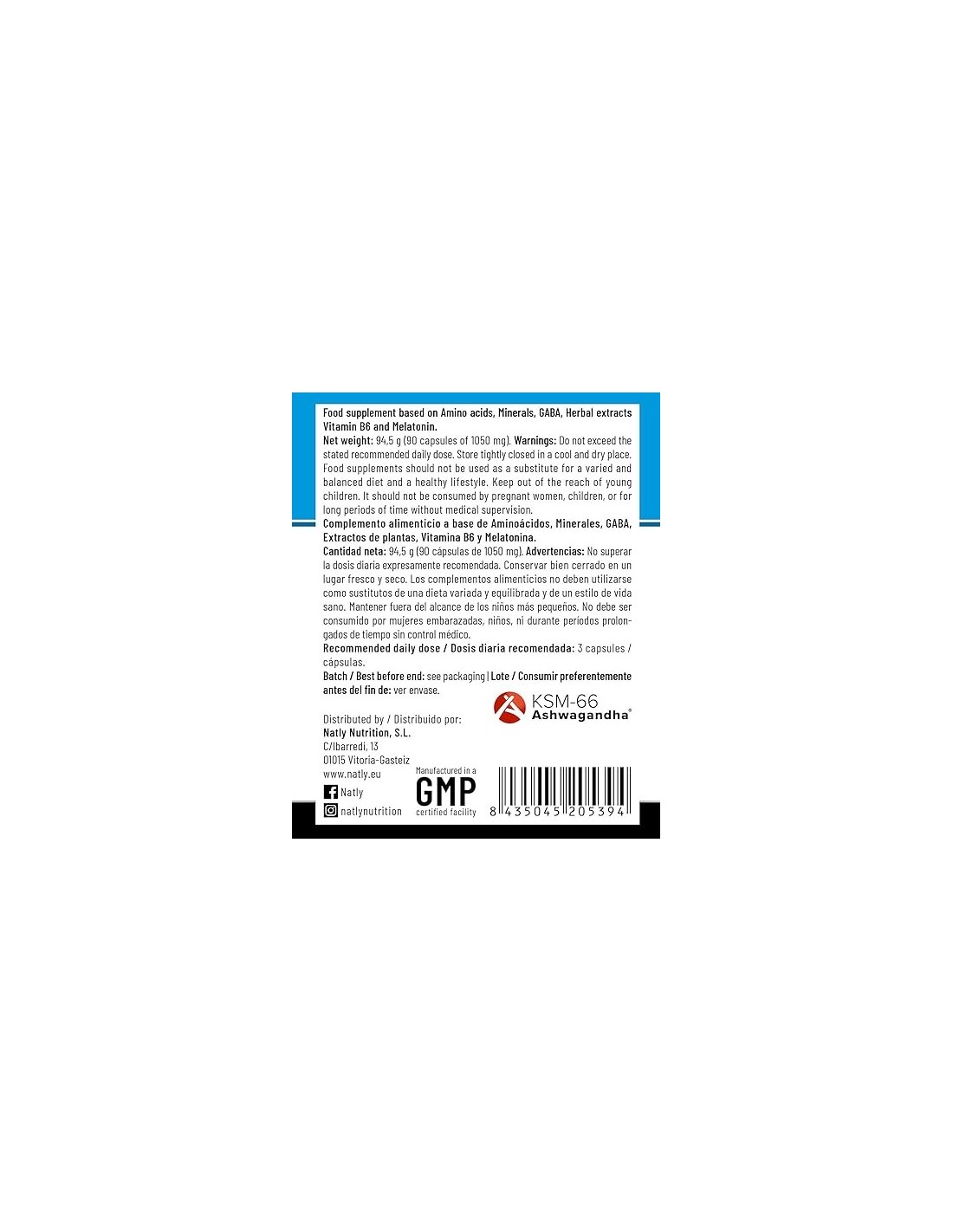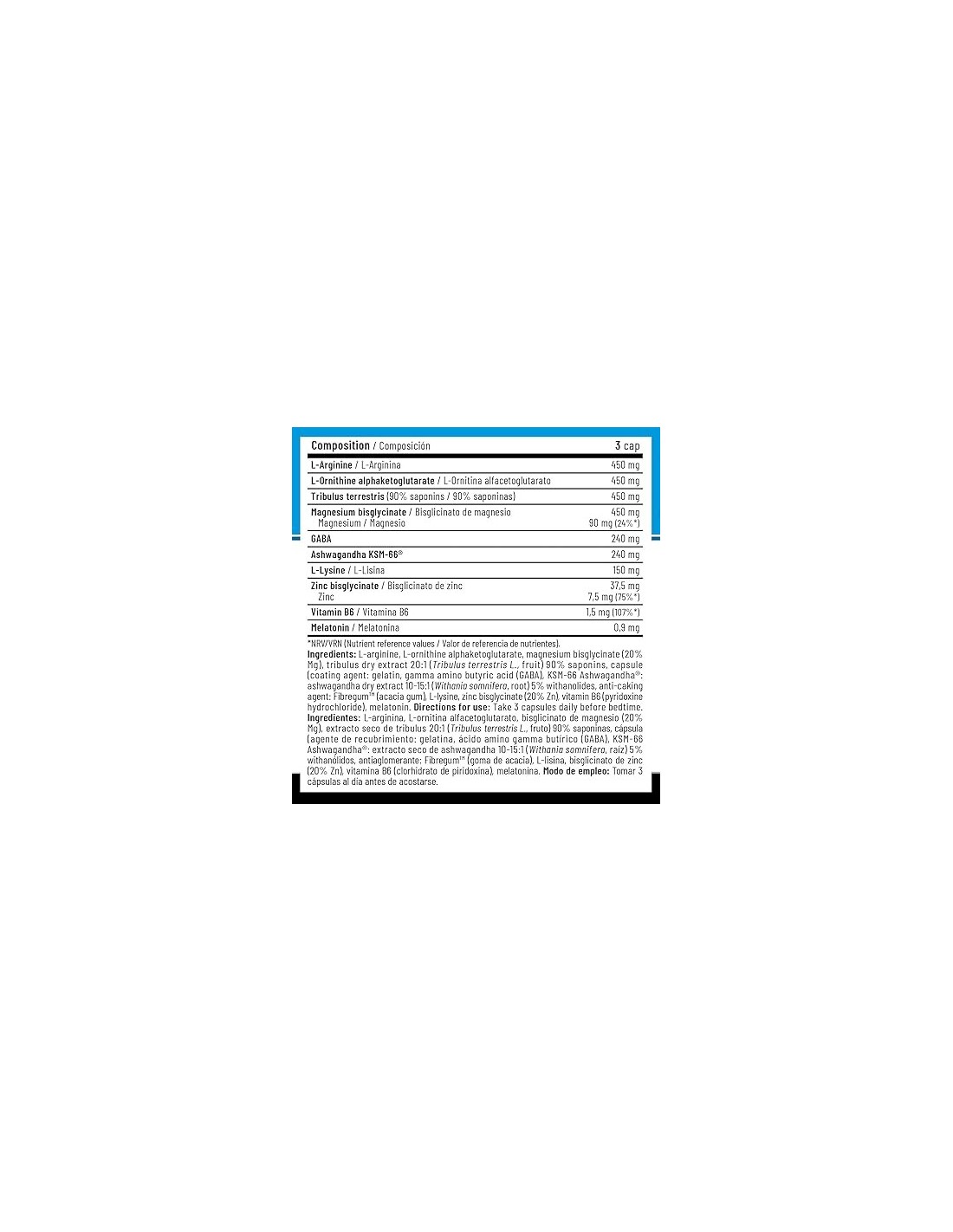 L-arginina, L-ornitina, bisglicinato de magnesio (20% Mg), extracto seco de tribulus 20:1 (Tribulus terrestris L., fruto) 90% saponinas, agente de recubrimiento: hidroxipropilmetilcelulosa, ácido amino gamma butírico (GABA), KSM-66 Ashwagandha®: extracto seco de ashwagandha 10-15:1 (Withania somnifera, raíz) 5% withanólidos, antiaglomerante: Fibregum® (goma de acacia), L-lisina, bisglicinato de zinc (20% Zn), melatonina.
