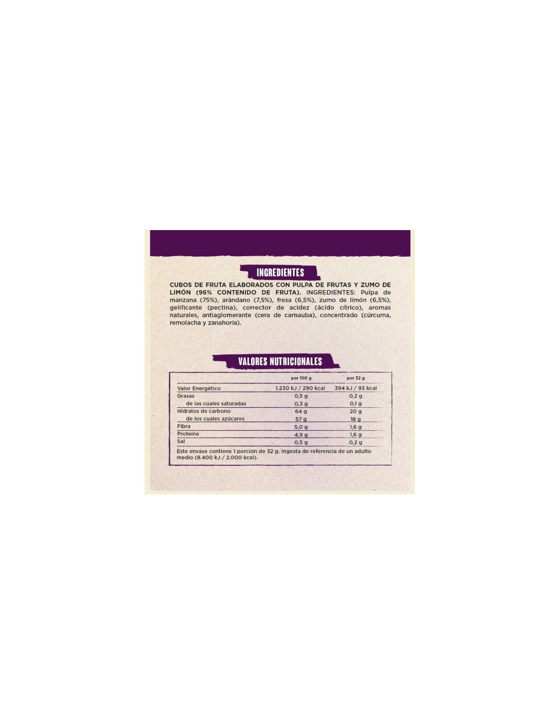 Pulpa De Manzana 75% , Arándanos Rojos (7.5%) , Fresa (6.5%) , Zumo de Limón (6.5%) , Gelificante ( Pectina ) , Corrector De Acidez ( Ácido Cítrico ) , Aromas Naturales , Antiaglomerante ( Cera de Carnaúba ) , Concentrado ( Cúrcuma , Remolacha , Zanahoria )