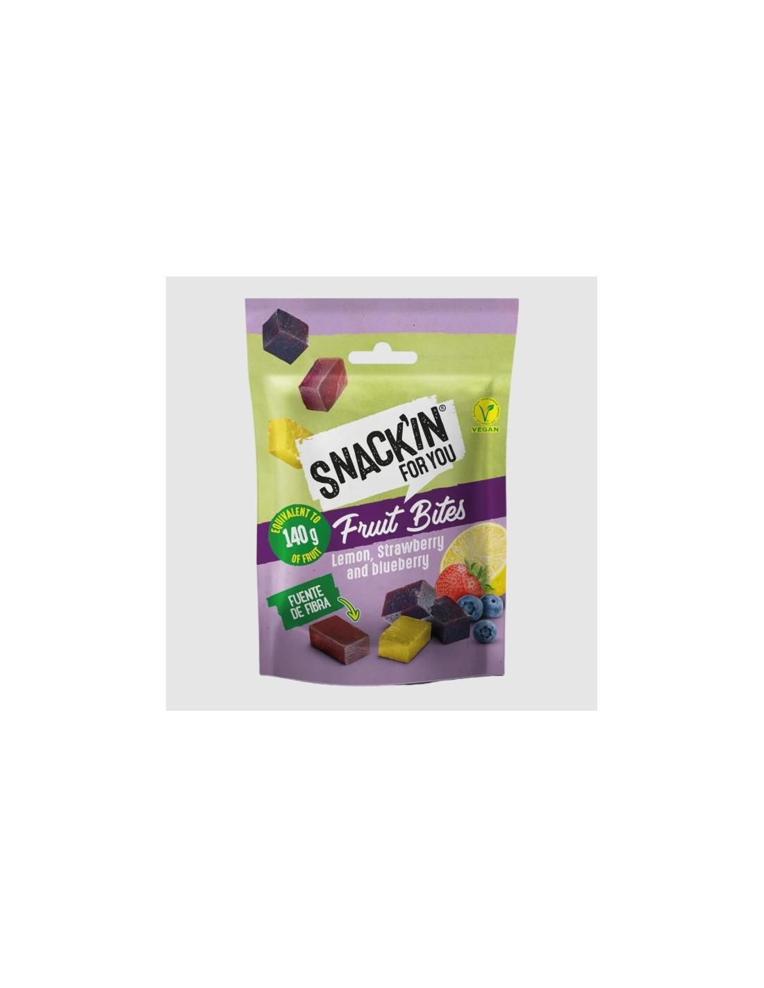 Fruit Bites 32g de Snack´in For You, son dulces piezas de fruta gelificadas con pectina de la propia fruta. Un producto a base 96% de zumo de frutas.