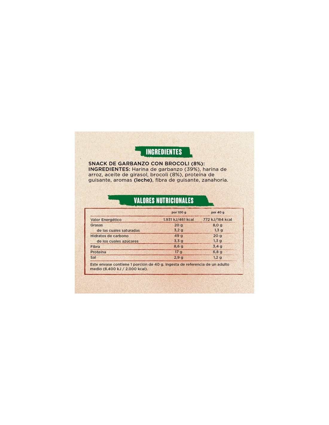 Harina de Garbanzo (39%) , Harina de Arroz , Aceite de Girasol , Brócoli (8%) , Proteína de Guisante , Aromas ( Leche ) , Fibra de Guisante , Zanahoria