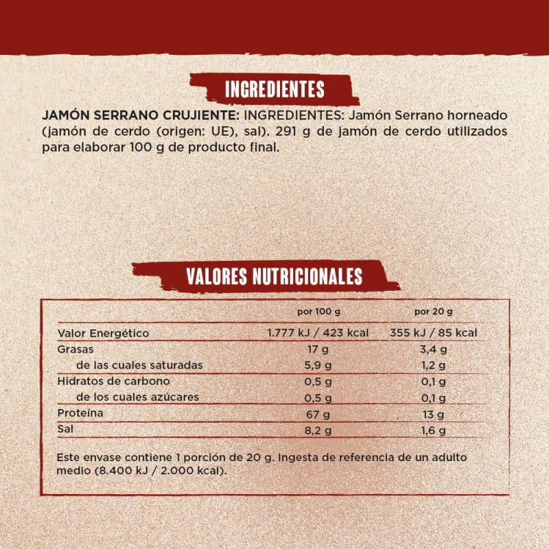 Exquisitas snack crips elaboradas con ingredientes 100% de origen natural, que aportan un auténtico sabor a jamón curado, en un formato de lo más práctico, perfectas para disfrutar en cualquier momento.