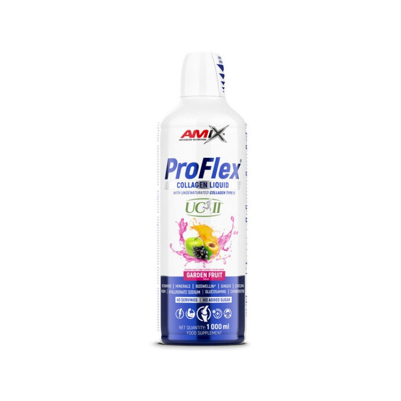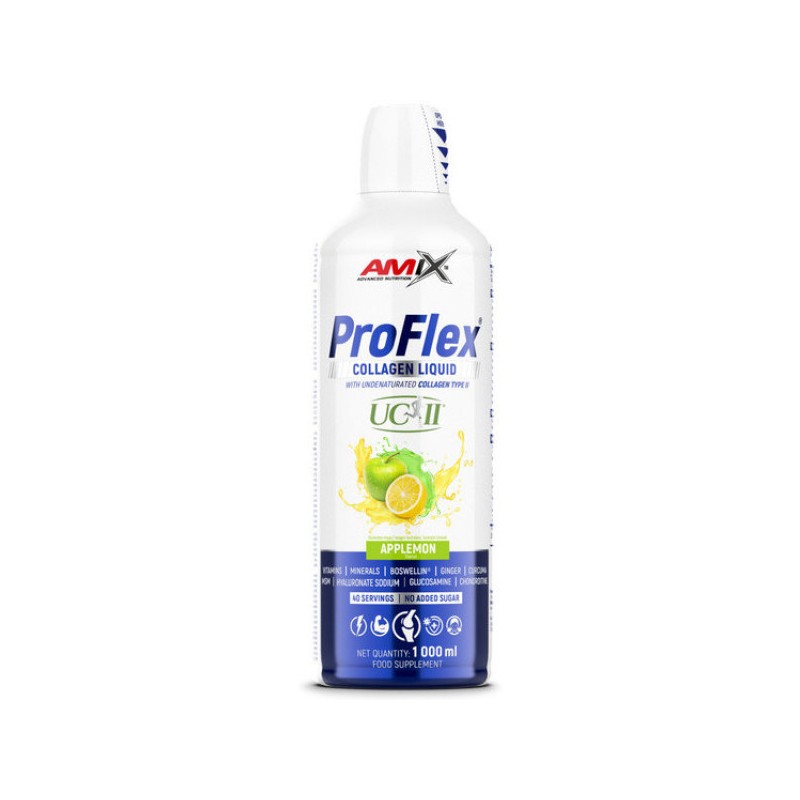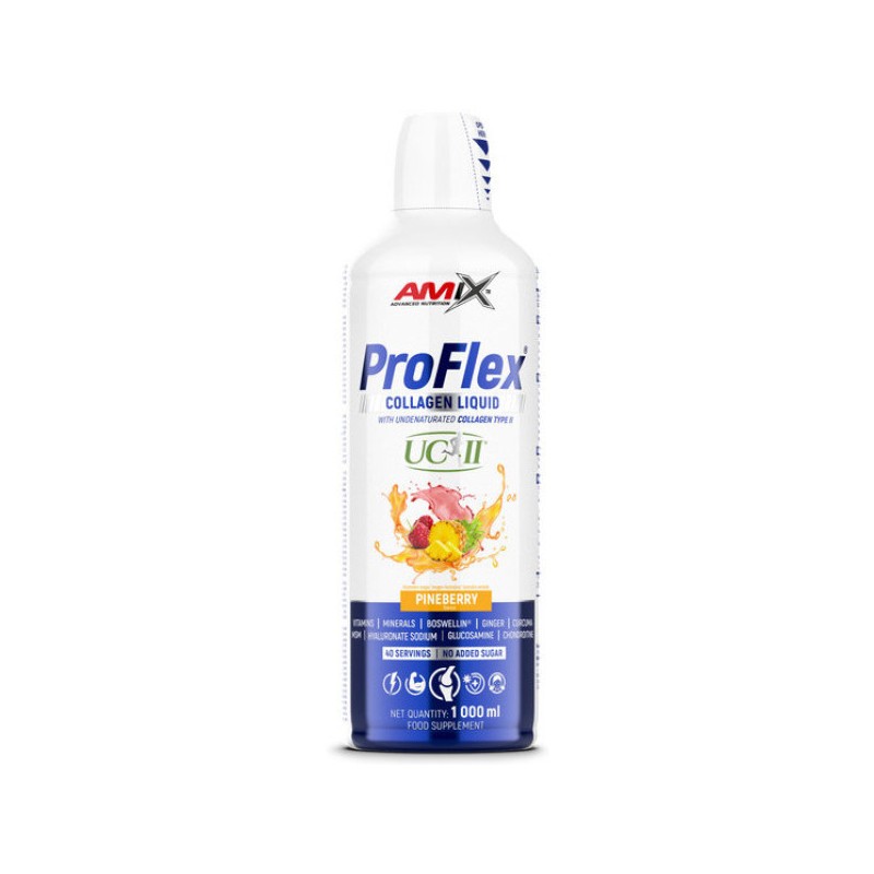 Amix™ ProFlex® Collagen Liquid es un complemento alimenticio líquido con edulcorantes para preparar una bebida. Combina hidrolizado de colágeno y UC-II® (colágeno tipo II no desnaturalizado), junto con sulfato de glucosamina, MSM, sulfato de condroitina, hialuronato sódico y glicina; además incluye un complejo de vitaminas, minerales y extractos vegetales/enzimas.