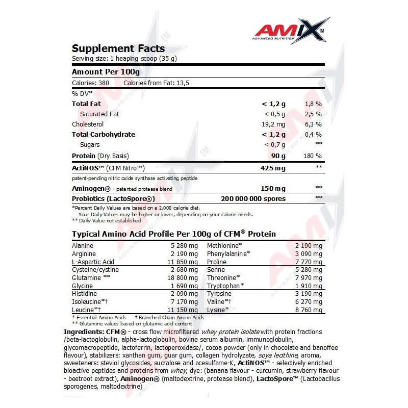CFM Nitro Protein Isolate de Amix Nutrition es un proteína de aislado de suero elaborada por Dennis Wolf. CFM Nitro Protein Isolate es una proteína que puede encuadrarse en el TOP de proteínas del mercado compuesta por la materia prima Glanbia CFM® y una patente que sintetiza el óxido nítrico, el Acti NOS™.