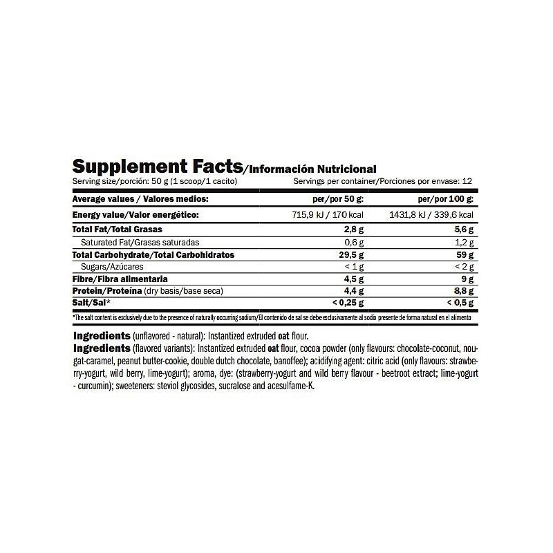 OatMash es un producto a base de harina de avena instantanea, es decir, tiene una disolución casi inmediata. OatMash es una fuente rica en hidratos de carbono de bajo índice glucémico, por lo que habrá un aporte sostenido de carbohidratos a nuestros músculos. Además es un producto que contien fibra, que ayudará a mejorar el tránsito intestinal, grasas insaturadas, que mejoraran tu perfil lipídico, y muchas vitaminas y minerales que ayudarán a mantener tus funciones biológicas.