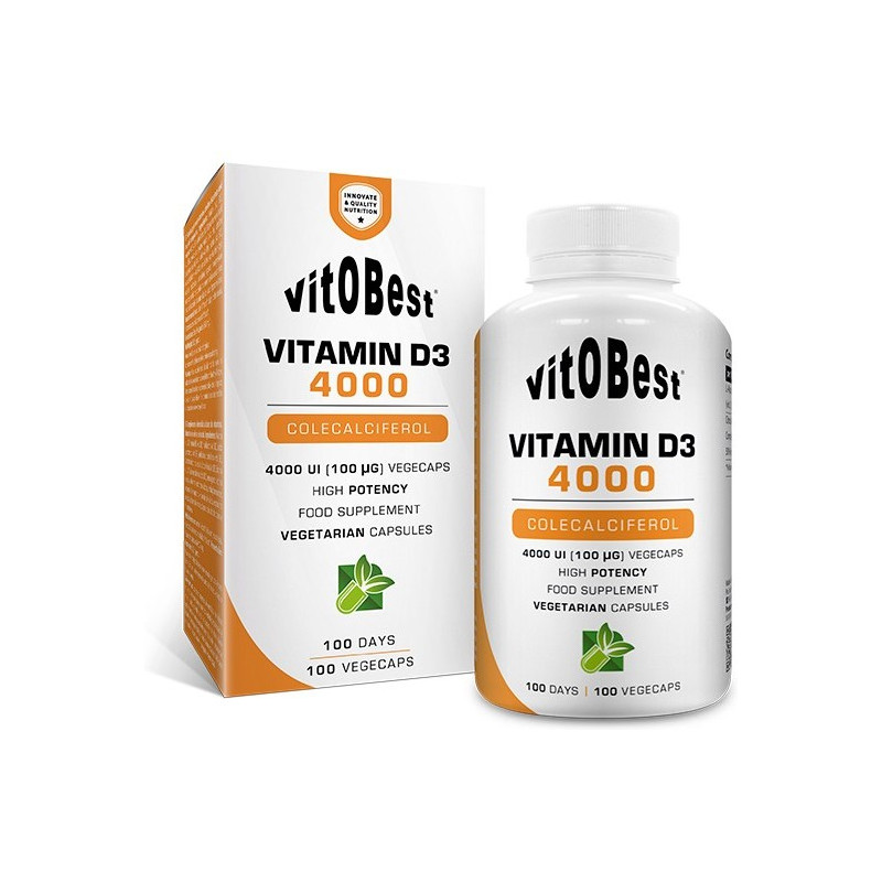Vitamin D3 4000, de Vitobest®, contiene 4000 UI (100 µg) de vitamina D3 por cápsula y contribuye al funcionamiento normal de los músculos y el sistema inmunitario, y al proceso de división celular. Además, ayuda a garantizar una buena absorción intestinal de calcio y fósforo (dos elementos imprescindibles y necesarios para la formación y funcionalidad del tejido óseo del cuerpo), a mantener niveles normales de calcio en sangre, y a reducir el riesgo de caídas relacionado con la inestabilidad postural y con la debilidad muscular.